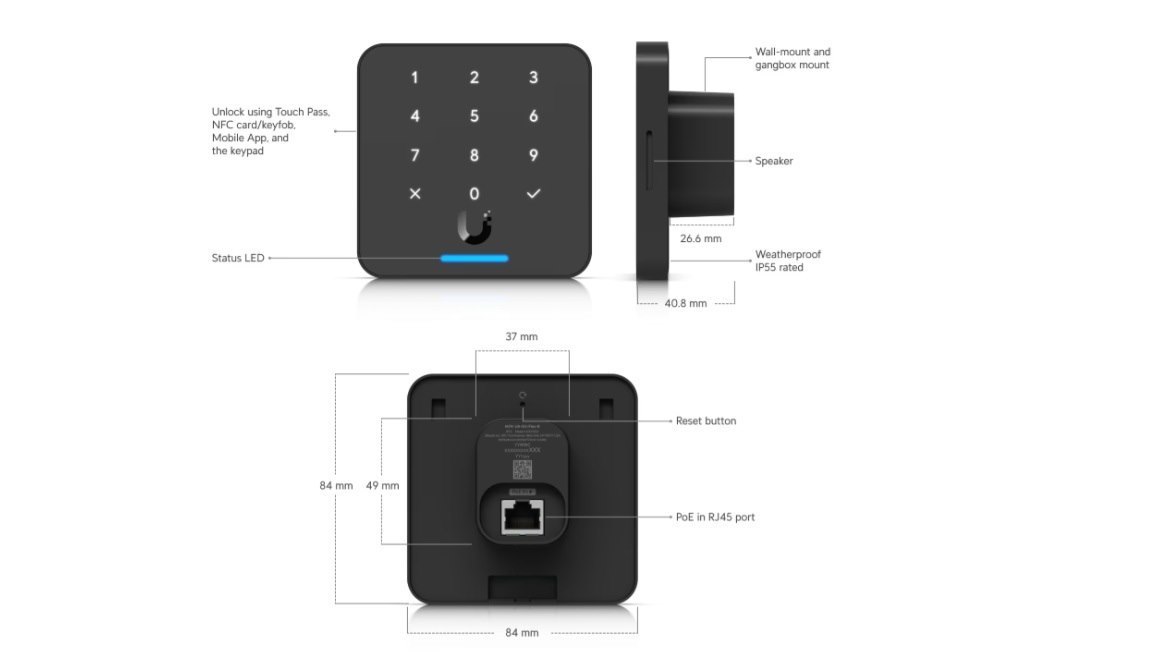 Access Methods: NFC card & keyfob, PIN, mobile unlock (Apple/Google Wallet)