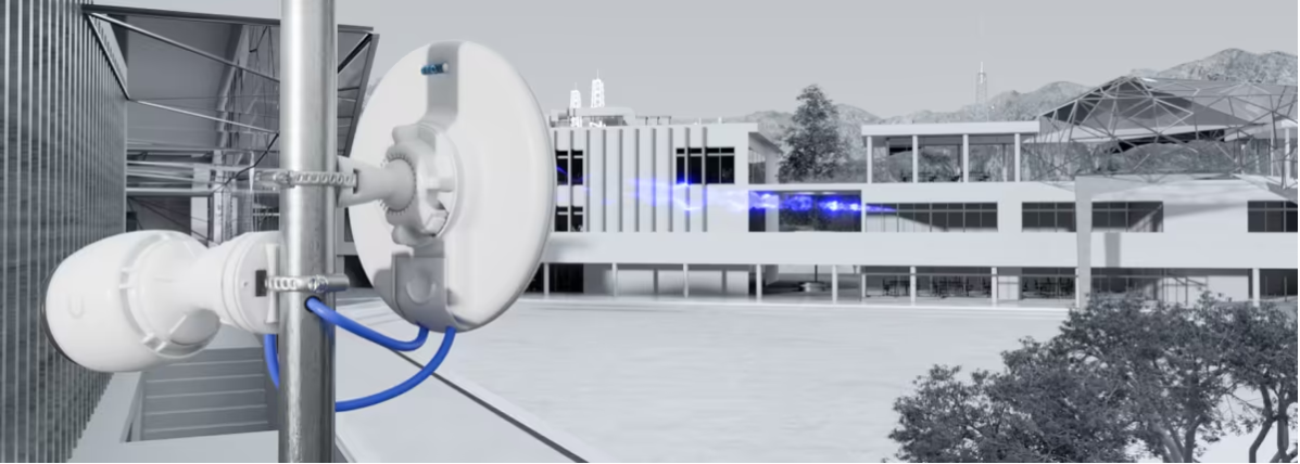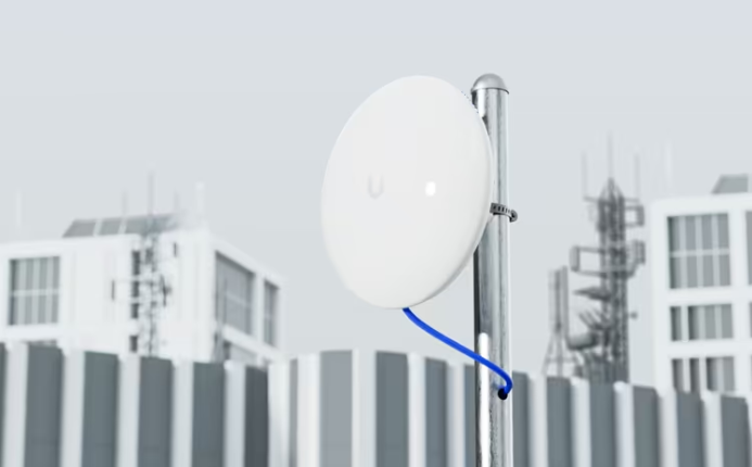5 GHz wireless bridge with PoE output that connects at 5+ km distances or seamlessly uplinks to UniFi WiFi.