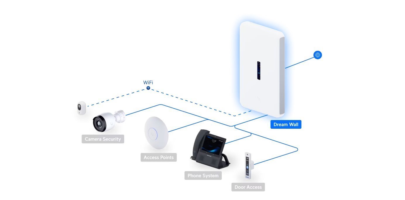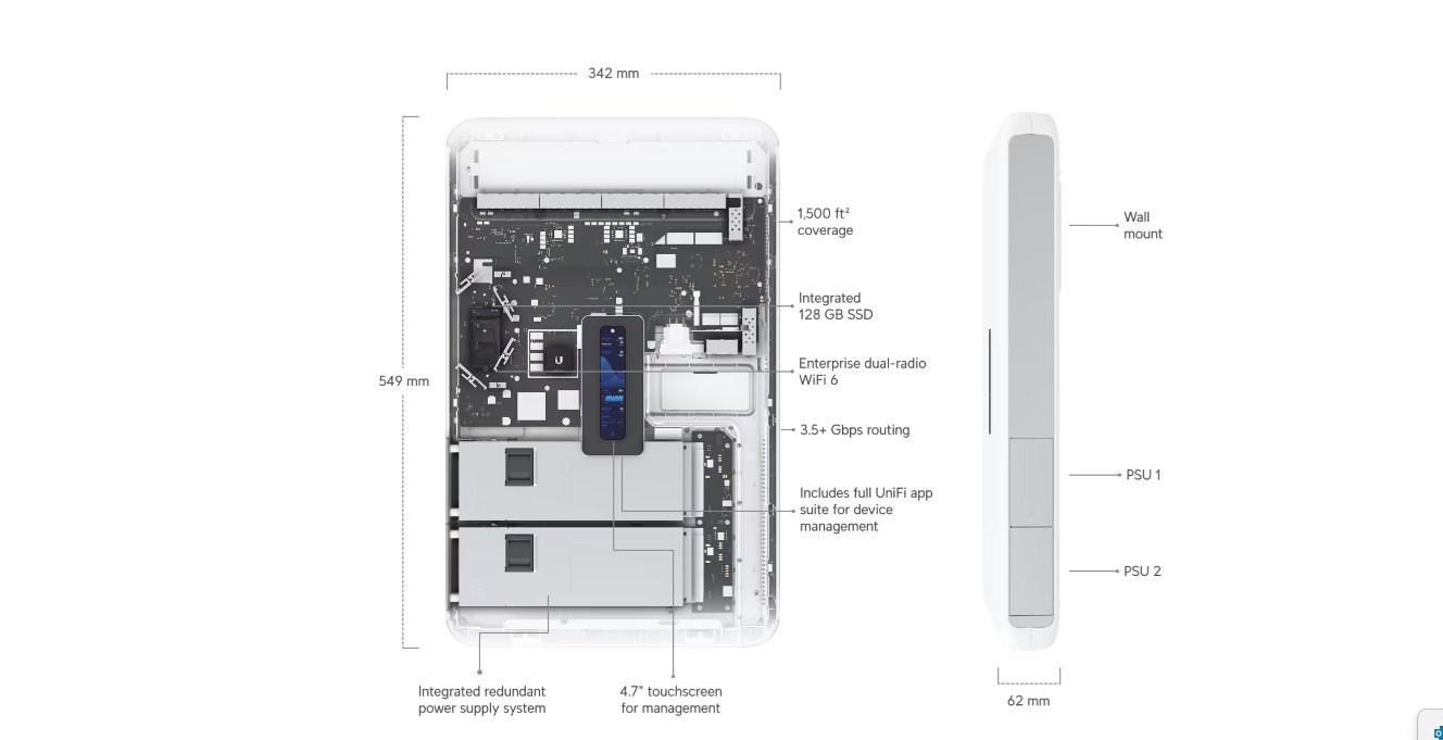 Wall-mounted 10G Cloud Gateway with integrated WiFi 6, high-power PoE switching, and full UniFi application support.