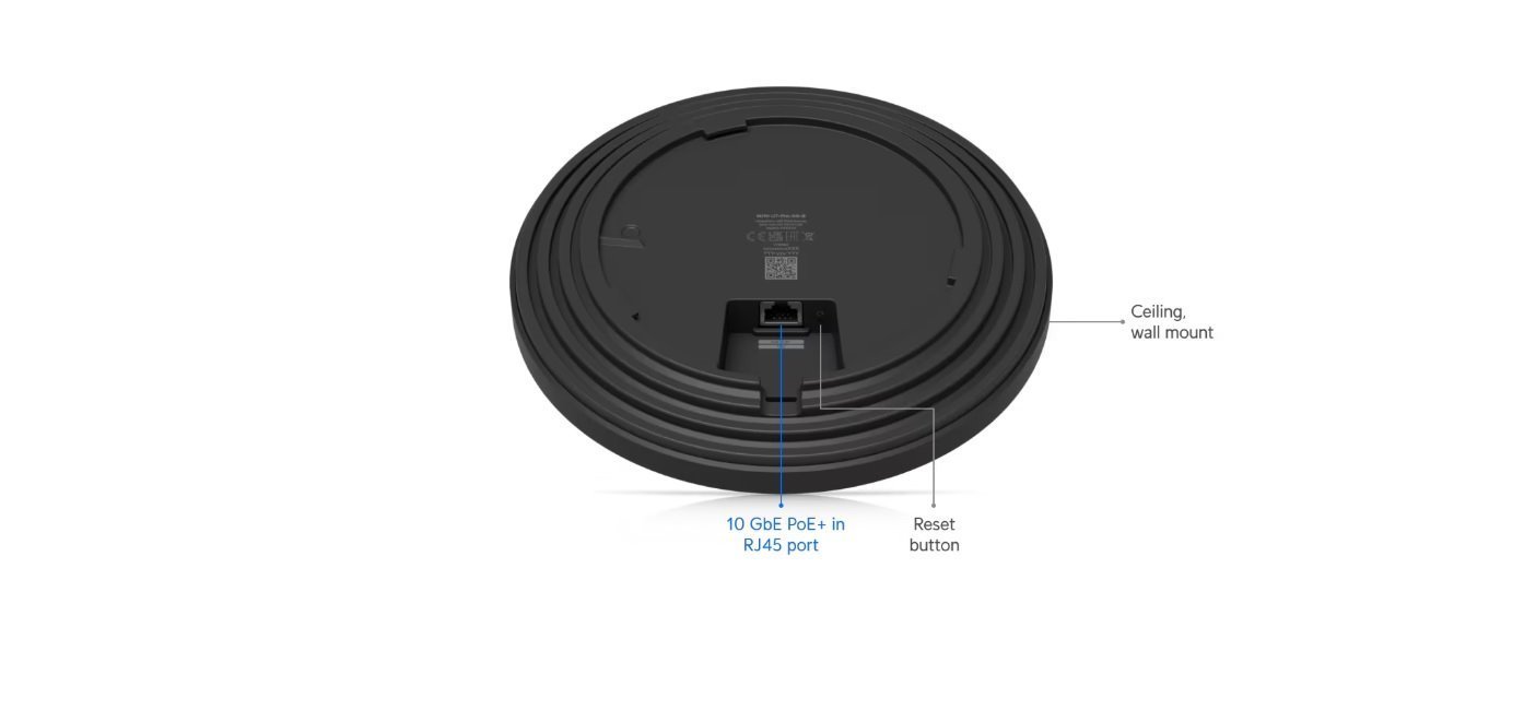 Ceiling-mounted 6-stream WiFi 7 AP with 10/5/2.5/1 GbE support.